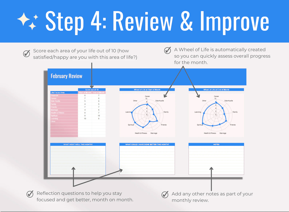 ✓ Step 4: Monthly Review (+ fully automated Wheel of Life charts showing your progress in your life focus areas)