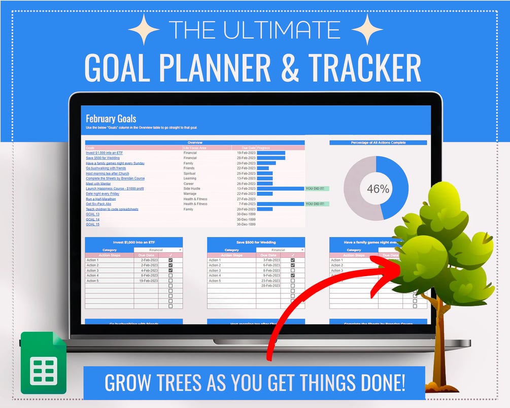 To use this Google Sheets goal planning template, simply enter in your monthly goals, actions for each goal, and then check them off when you do them. Everything else is fully automated, including watching trees grow as you complete more and more actions! Your goal is to plant as many fully-grown trees as possible every month.