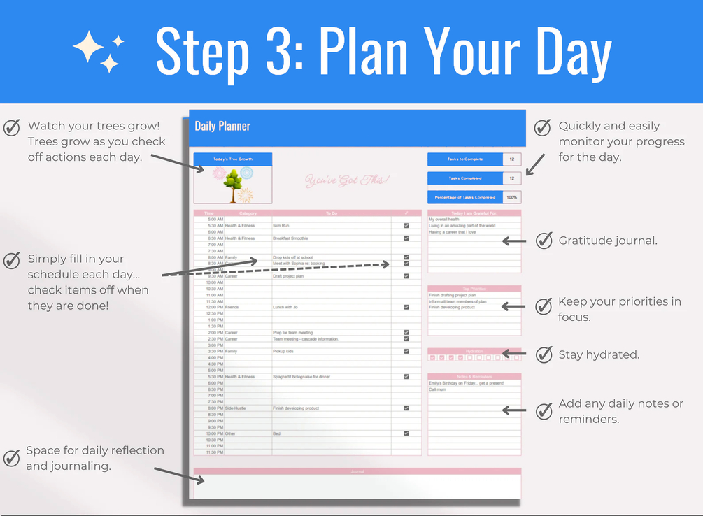 ✓ Step 3: Daily Planner (+automatic tree growing as you check off your tasks each day!)