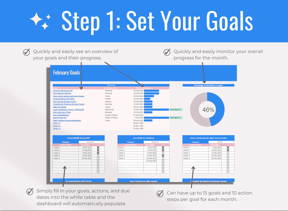 ✓ Step 1: Set Your Monthly Goals (+ fully automated dashboard with summary of goals and progress)